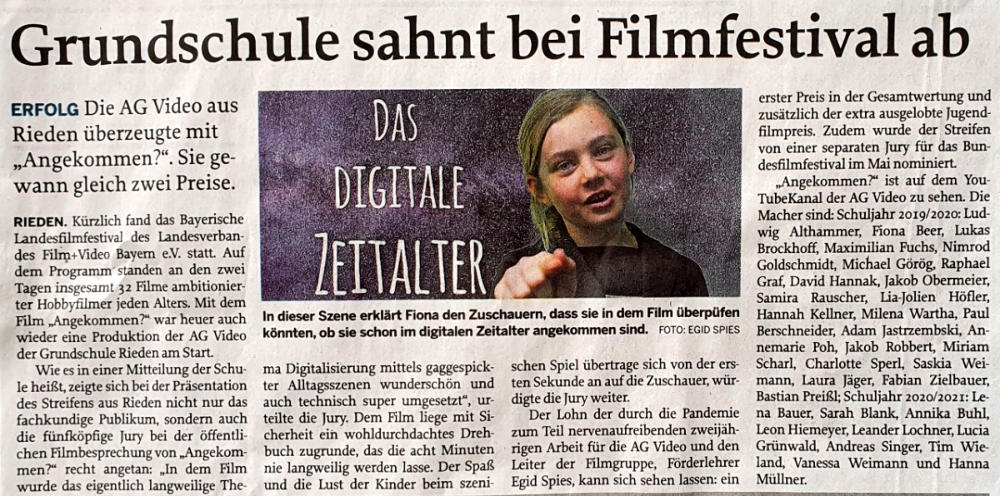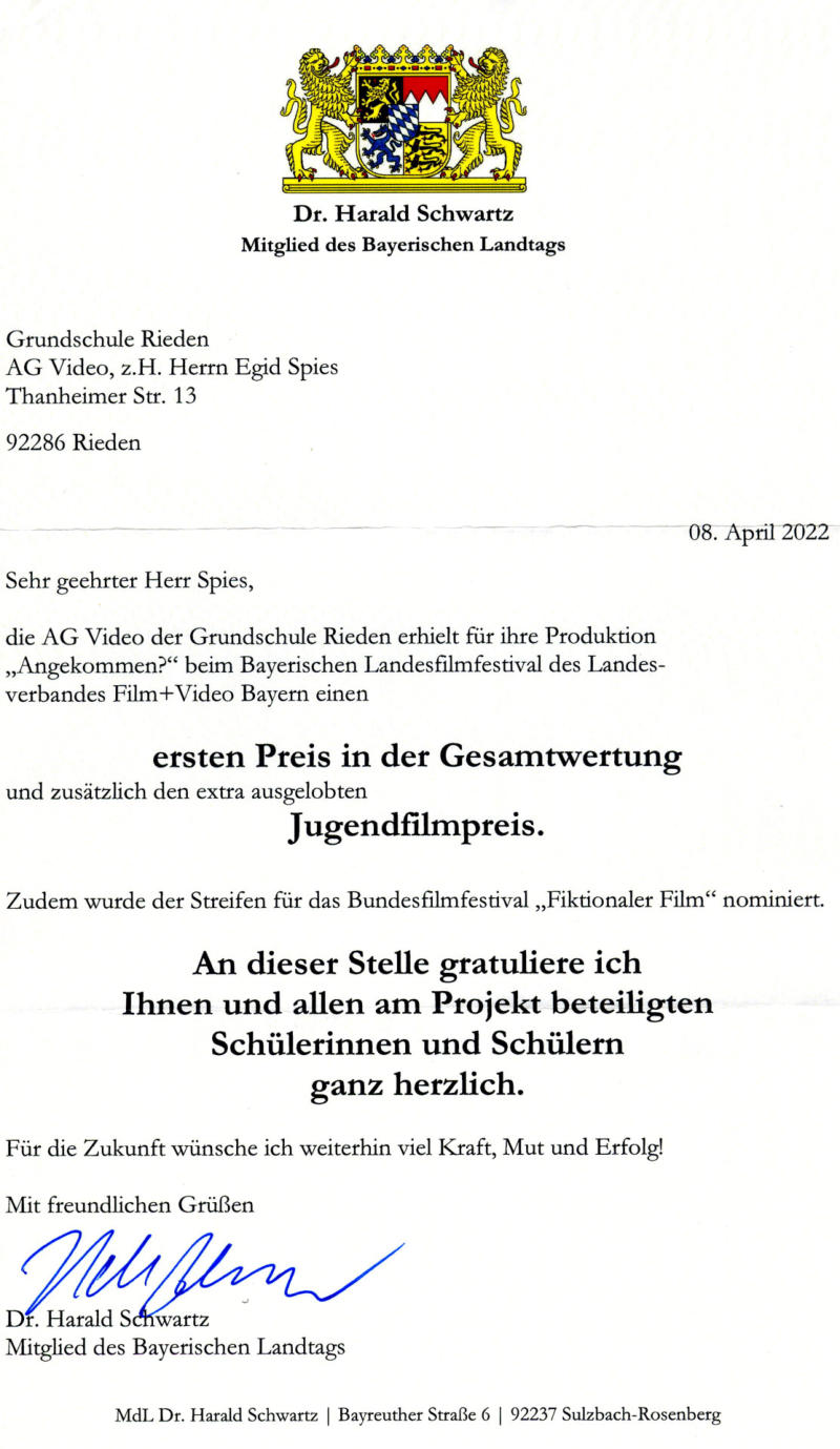 Bamberg einen 1. Preis. Zudem erhält der Film den Jugendilmpreis und wird für das Bundesfilmfestival