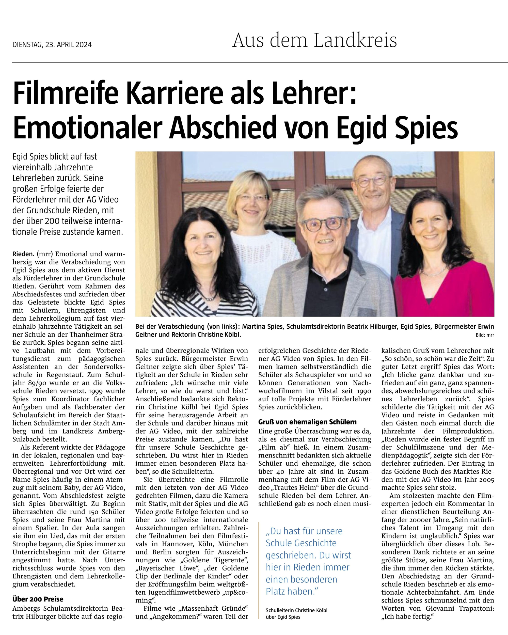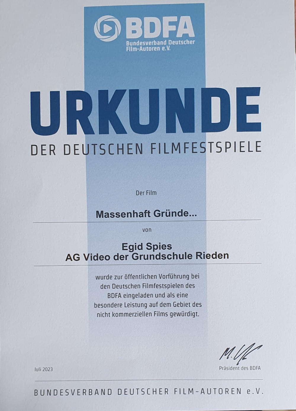 den Jugendfilmpreis. Zudem wurde dem vollkopmmen überraschten Herrn Spies unter „Standing