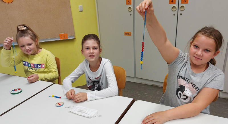 Die Kinder der 4b und Frau Spies basteln für die 1a Rechenketten. Danke!